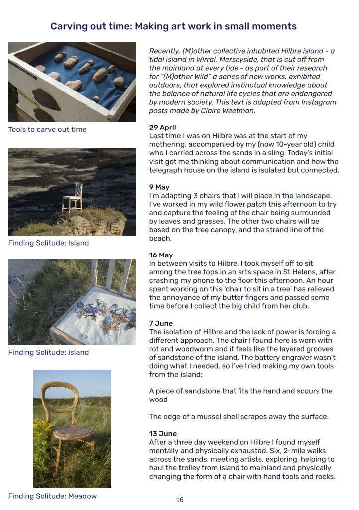 Our explorations of mothering and practices of care in this remote location have informed our collective creative practice where we aim to respect the ebbs and flows of creativity within (m)otherhood – connecting to the central research themes of Drawing out Hilbre that explore Sustainability and Self Sufficiency, Time and Tides and Engagement with Nature.
