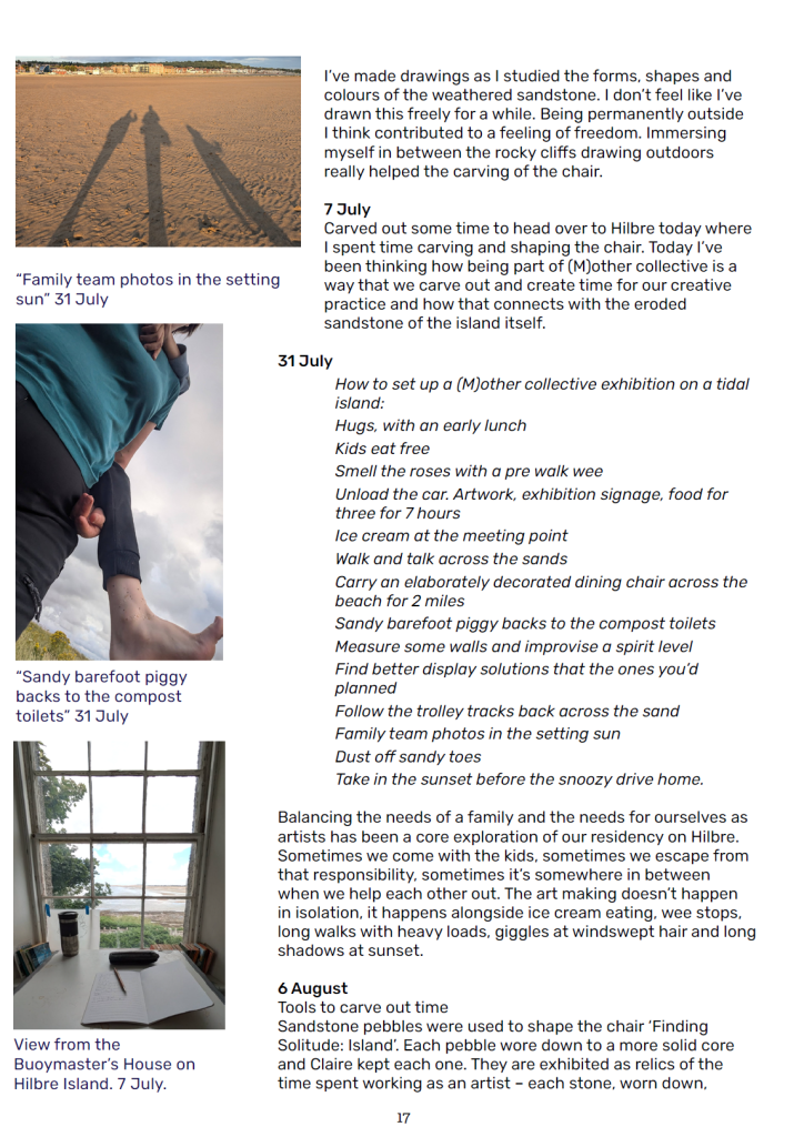 7 July Carved out some time to head over to Hilbre today where I spent time carving and shaping the chair. Today I’ve been thinking how being part of (M)other collective is a way that we carve out and create time for our creative practice and how that connects with the eroded sandstone of the island itself.